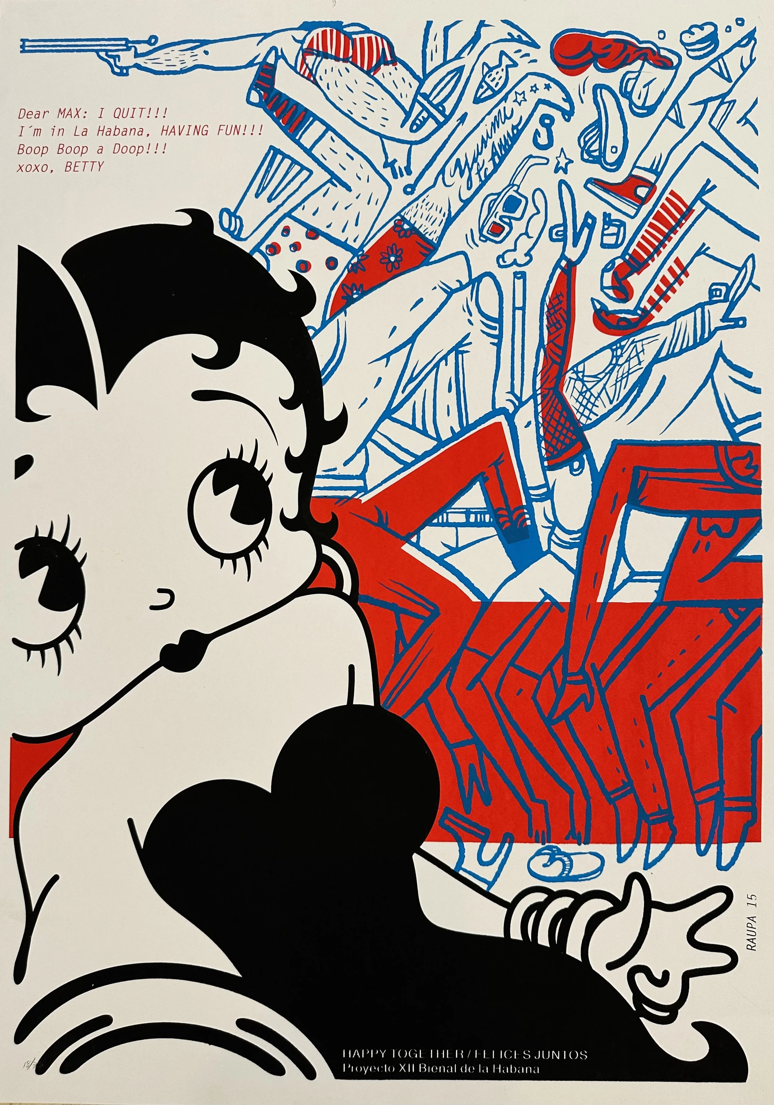 This poster is part of the Felices Juntos (Happy Together) series, a graphic project exhibited during the 12th Havana Biennial. With an optimistic tone, it aimed to visualize the willingness for dialogue between Cuba and the United States, using iconic cartoon and comic strip characters from each country as a pretext.