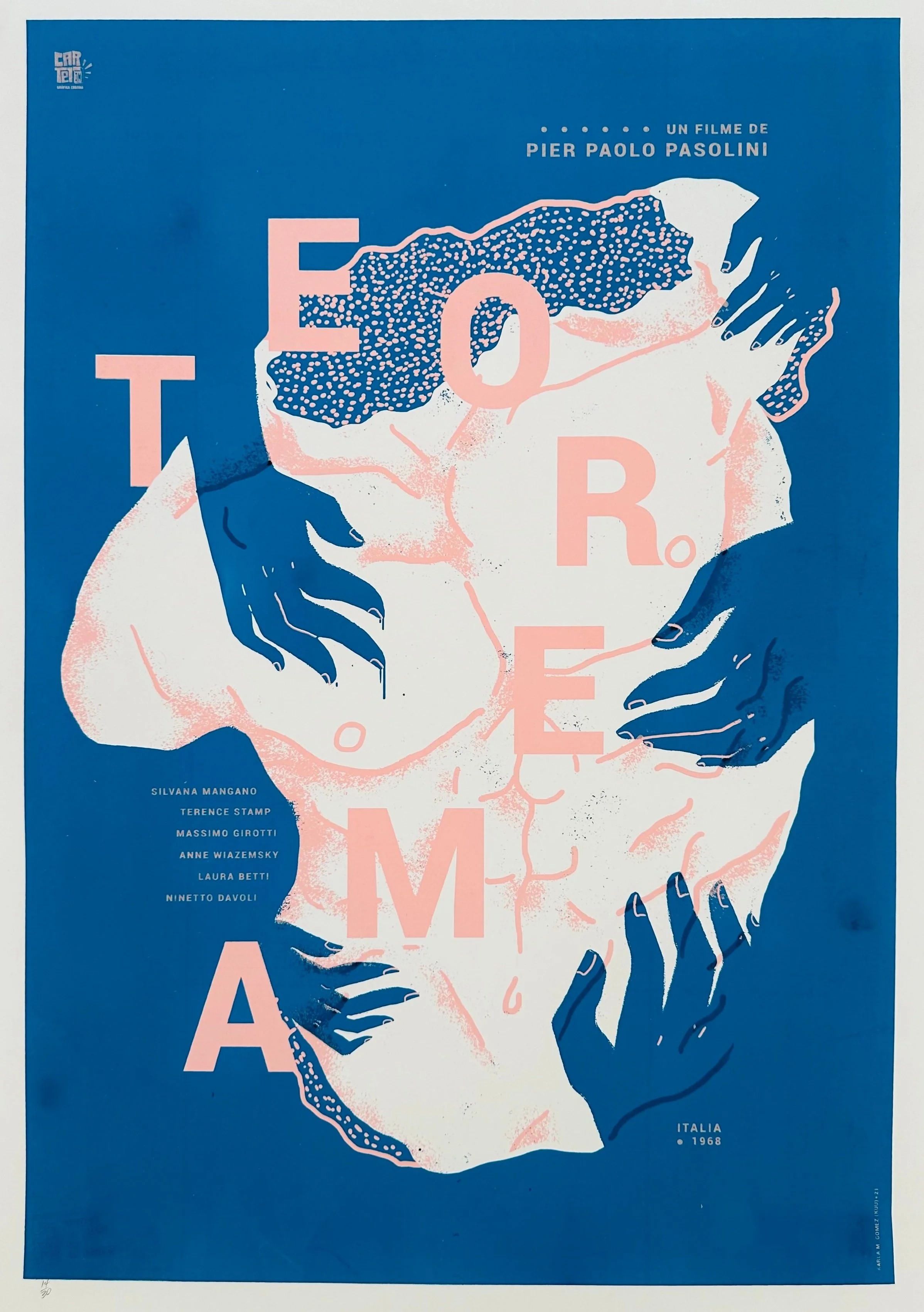 This poster for Pasolini’s Teorema was designed by Cuban artist Karla M. Gomez. Teorema, known as Theorem in the United Kingdom, is a 1968 Italian surrealist psychological drama film written and directed by Pier Paolo Pasolini.