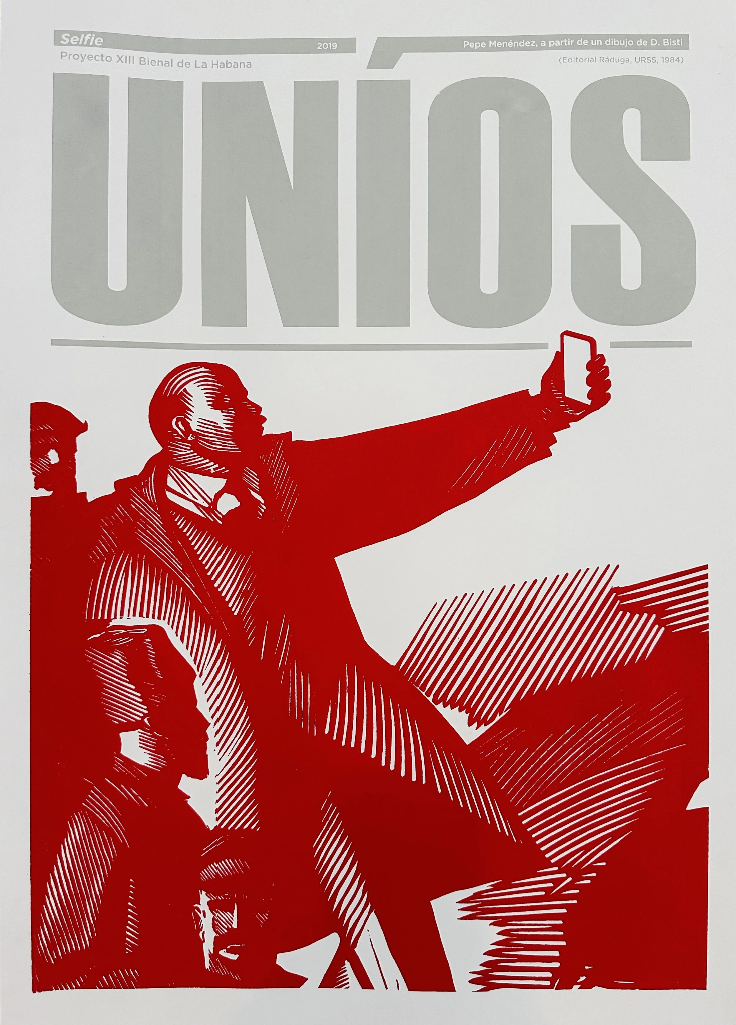 This poster is part of the Selfie series, which explores the selfie as an artistic medium for portraiture. In this instance, the acclaimed designer draws inspiration from a 1984 illustration by D. Bisit and incorporates the image of Lenin, a figure familiar to Cubans since the adoption of communist ideology by the Cuban government in 1962. The poster also features part of the emblematic political slogan, “Workers of the world, unite!” later popularized as one of the rallying cries of The Communist Manifesto (1848) by Karl Marx and Friedrich Engels.