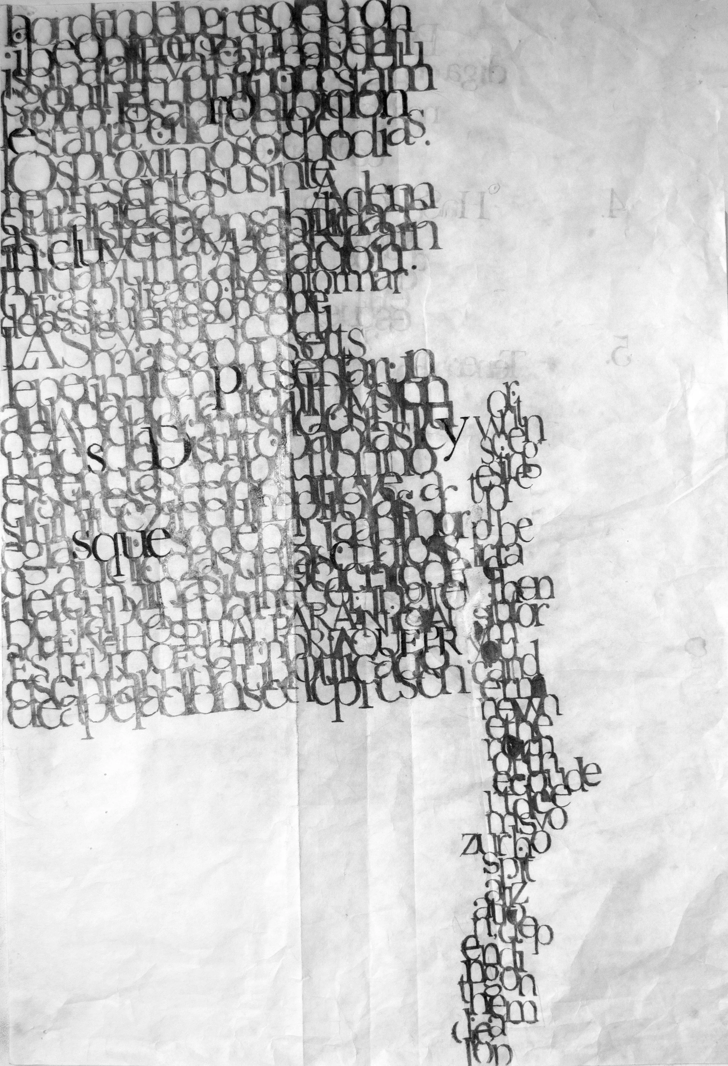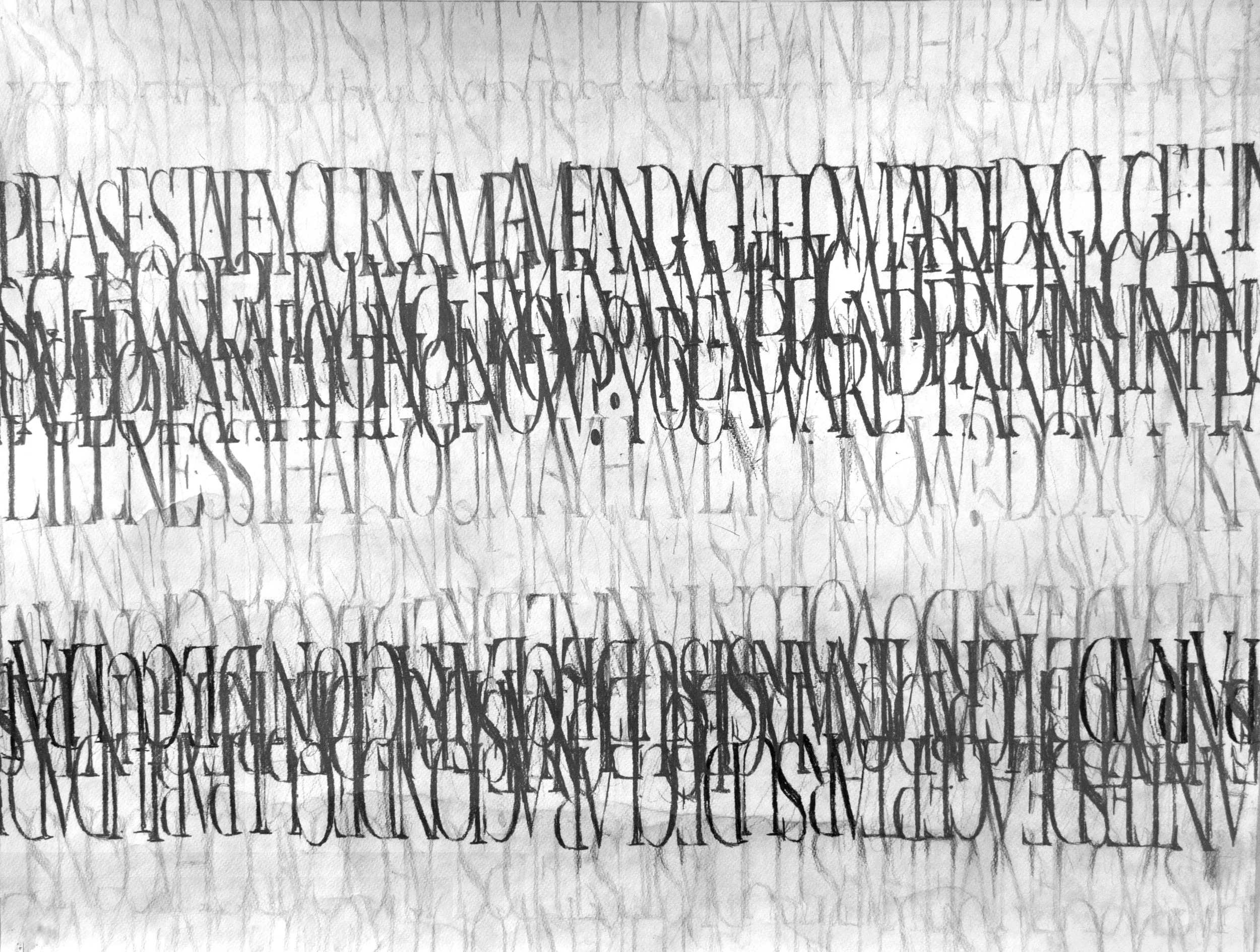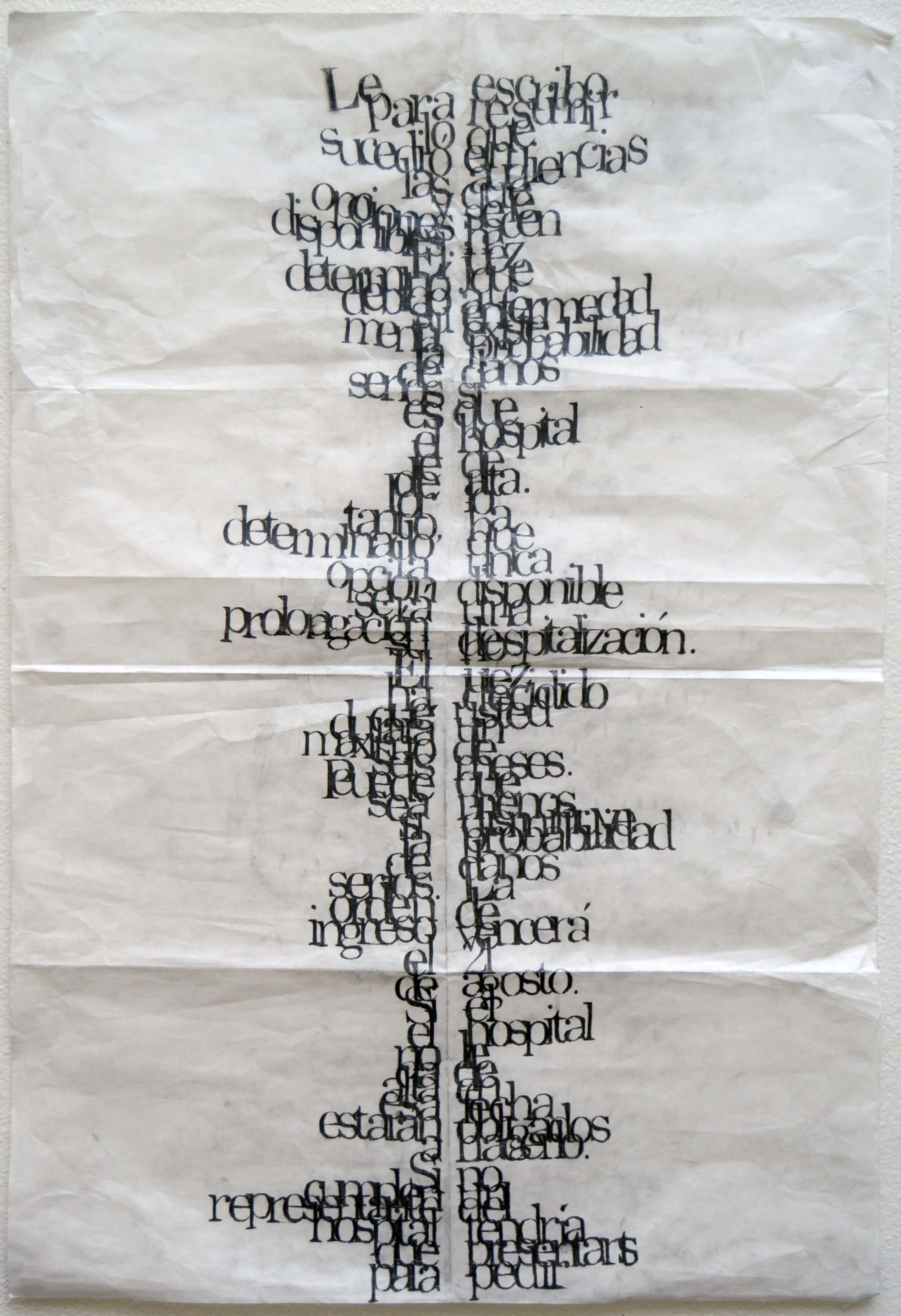 In the layered text of Sosa's drawings, words struggle to be seen, heard, and understood. Sourced from legal documents, letters combine and emerge from one another, nearly obliterated only to be redrawn once again. Sosa reprises the theme of illegibility in a video piece in which the voices of multiple court interpreters incant the text of an immigration warning read to defendants who have plead guilty to a crime. A floor-to-ceiling installation of translucent sheets of paper features poignant messages exchanged between defendants and their loved ones.