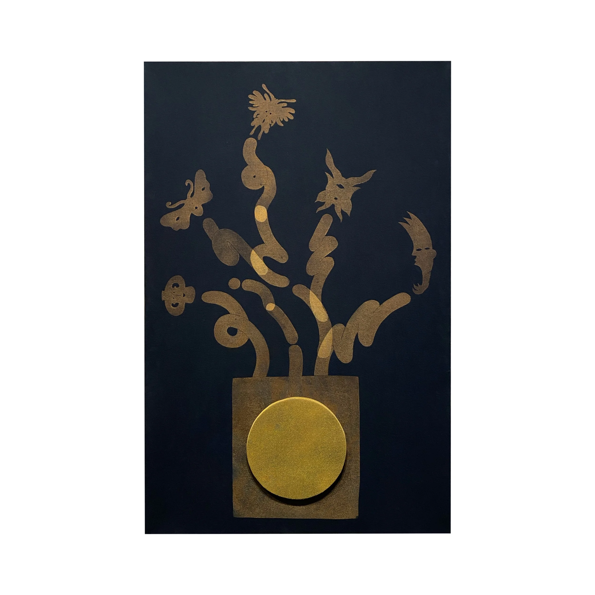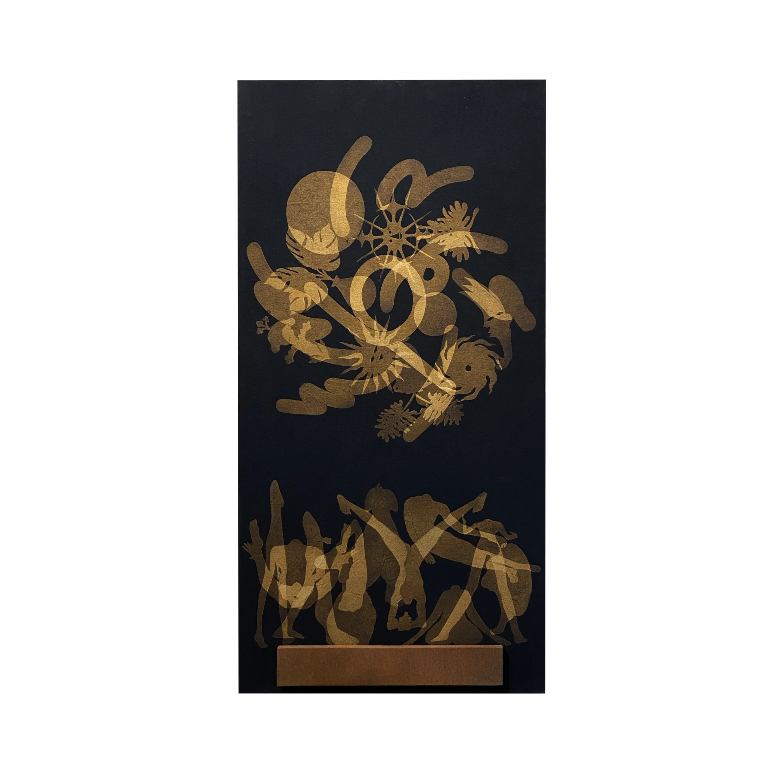 Both artists are led by curiosity, either towards strangers or realities we ignore. While Sebastian covers the inner layer of the works with fabric to mirror the desire of dissecting or unveiling someone’s identities, Uziel’s installations uncover imaginary worlds for escape. Through engraving, stencil and airbrush on textiles, Uziel creates a system of hieroglyphs that maps the shapes and movements of the subconscious, and reveals what’s hidden in the fabric.
